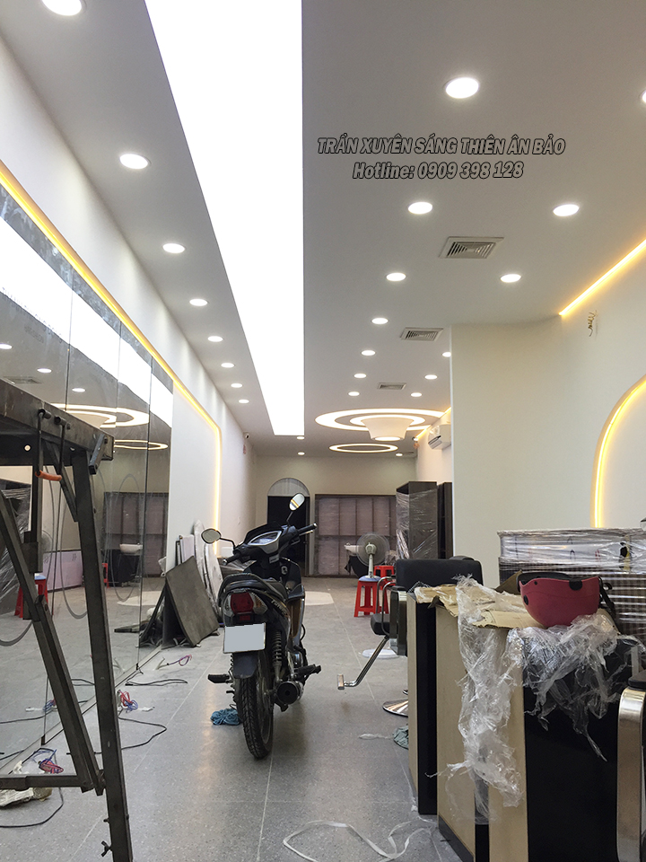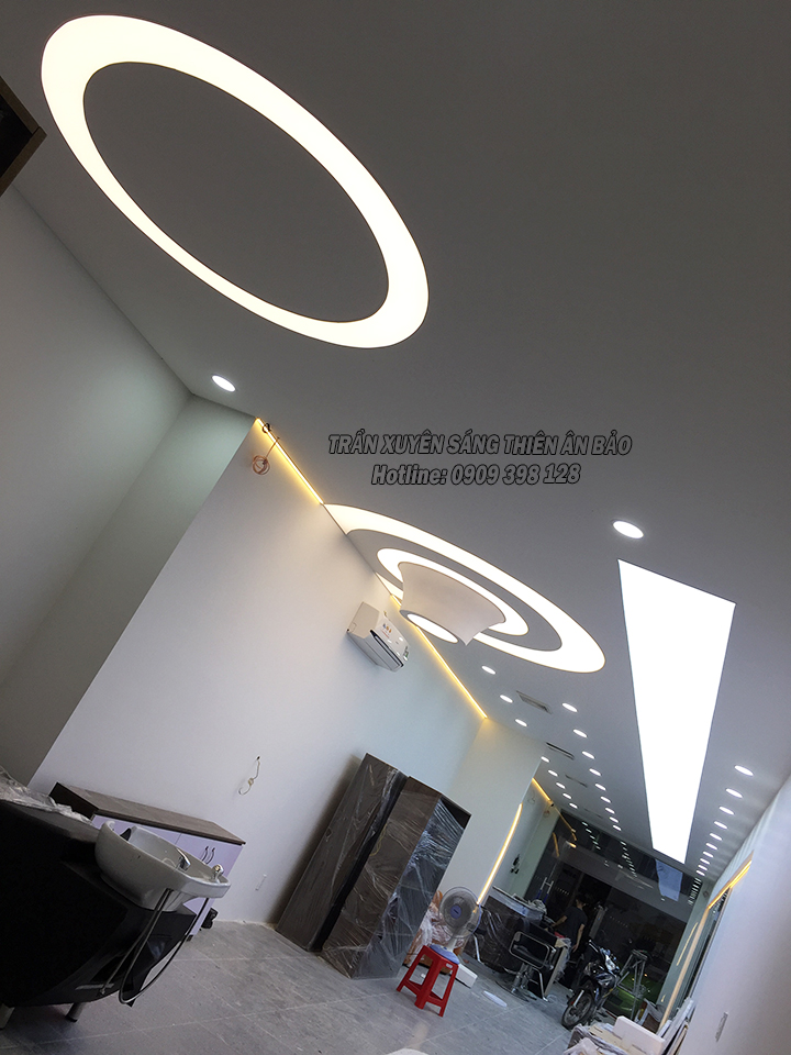 Trần xuyên sáng trắng được chủ đầu tư salon tóc lựa chọn trang trí cho salon Thanh Phương Đông tại TT. Cần Giuộc – Long An. Trần xuyên sáng trắng tạo sự trang nhã, lịch sự và sang trọng, đặc biệt ánh sáng được thiết kế theo tiêu chuẩn cao để đáp ứng yêu cầu khắt khe cho công việc của thợ làm tóc.